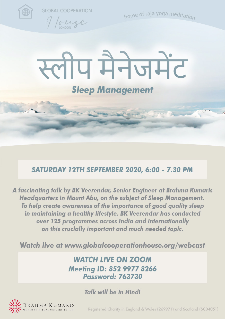 A fascinating talk by BK Veerendar, Senior Engineer at Brahma Kumaris Headquarters in Mount Abu, on the subject of Sleep Management. To help create awareness of the importance of good quality sleep in maintaining a healthy lifestyle, BK Veerendar has conducted over 125 programmes across India and internationally on this crucially important and much needed topic.