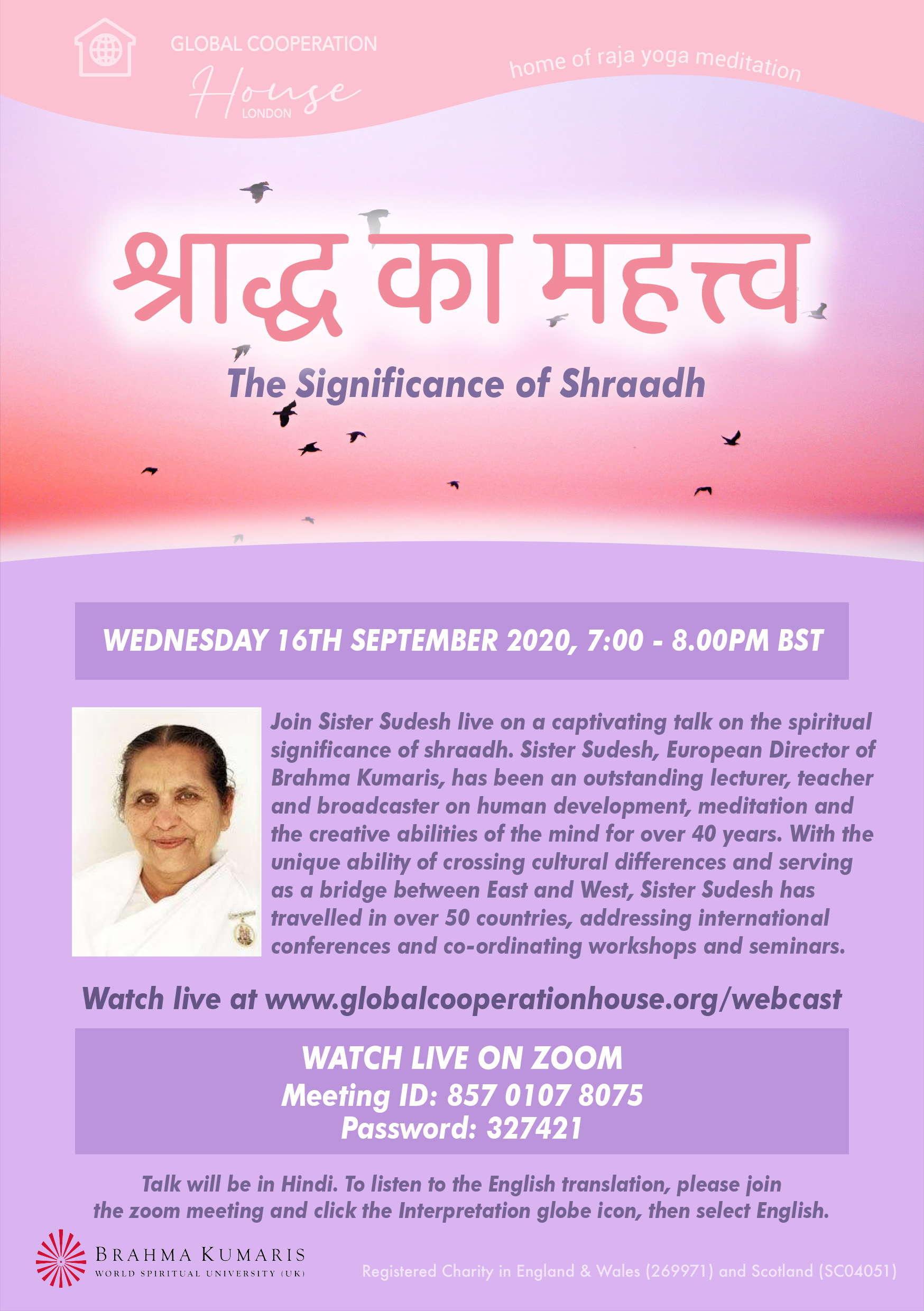 Sister Sudesh, European Director of Brahma Kumaris, has been an outstanding lecturer, teacher and broadcaster on human development, meditation and the creative abilities of the mind for over 40 years. With the unique ability of crossing cultural differences and serving as a bridge between East and West, Sister Sudesh has travelled in over 50 countries, addressing international conferences and co-ordinating workshops and seminars.