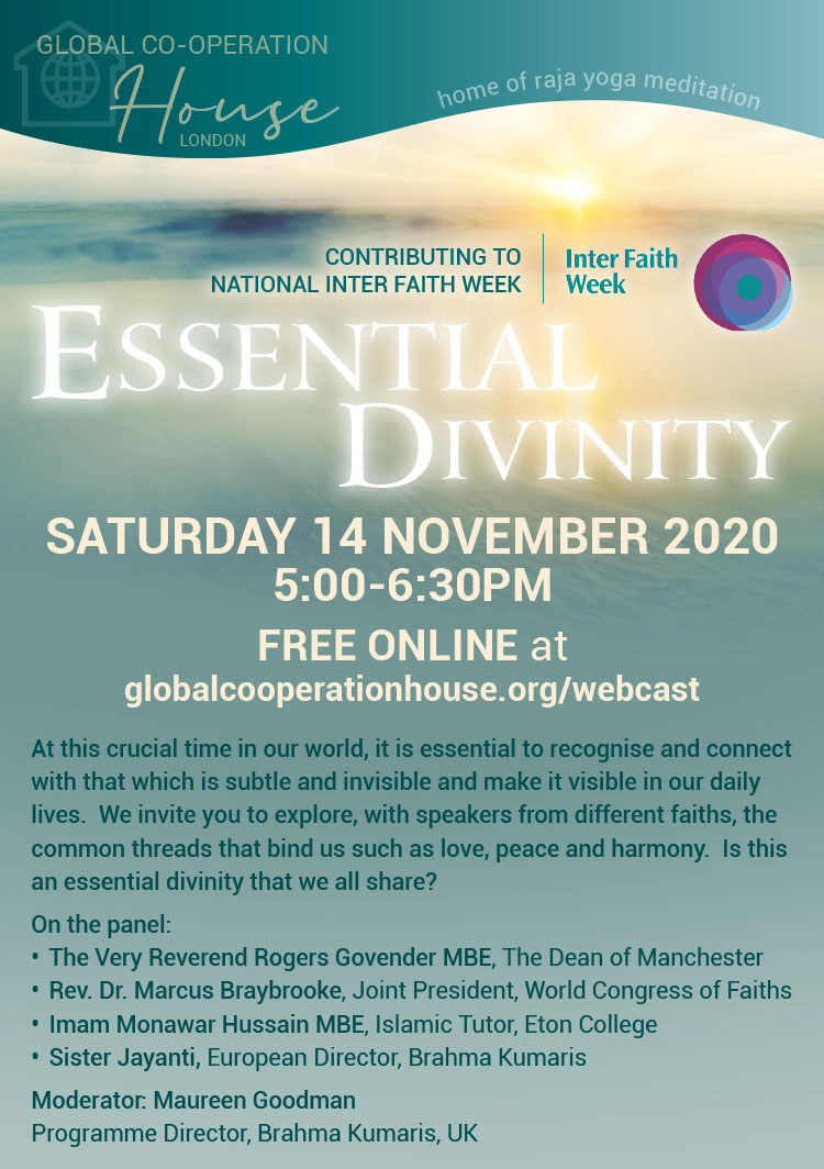 At this crucial time in our world, it is essential to recognise and connect with that which is subtle and invisible and make it visible in our daily lives. We invite you to explore, with speakers from different faiths, the common threads that bind us such as love, peace and harmony. Is this an essential divinity that we all share?