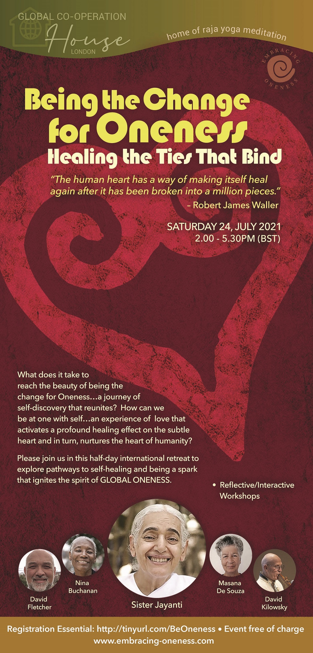 Please join us in this half-day international healing retreat to explore pathways to self-healing and being a spark that ignites the spirit of ONENESS in the human global family.