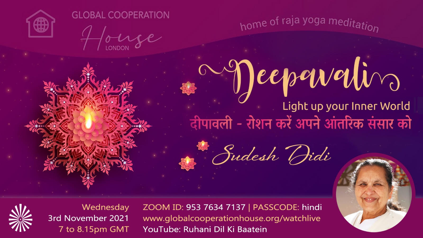 दीपावली हर वर्ष मनाया जाने वाला एक प्राचीन त्यौहार है। यह कार्तिक मास की अमावस्या को मनाया जाता है। यह दीपों का त्योहार आध्यात्मिक रूप से 'अन्धकार पर प्रकाश की विजय' को दर्शाता है। दीपावली यही चरितार्थ करती है- 'असतो मा सद्गमय, तमसो मा ज्योतिर्गमय'।' अर्हात् (हे भगवान!) मुझे अन्धकार से प्रकाश की ओर ले जाइए। सुदेश दीदी के द्वारा हम जानेंगे कि कैसे हम अपने आंतरिक जगत को रोशन करें।